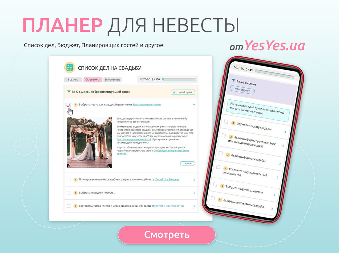 Свадебная подготовка полна неожиданных сложностей и волнений. Чтобы не растеряться в лавине предсвадебных дел, заходи в наш Онлайн-планировщик: мы расписали для тебя все самые важные задачи и оставили подсказки, которые помогут с организацией.