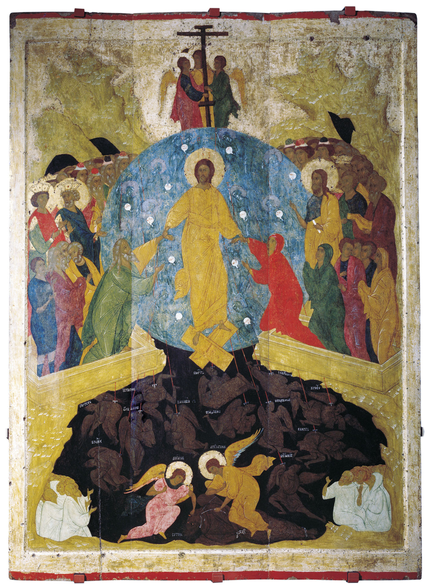 Другой пример — из иконописи, которая, безусловно, является зримым выражением учения Церкви. На изображении Второго Пришествия, как оно представлено в притворах монастырских храмов, мы видим следующее: от престола Божия исходит свет, объемлющий святых, и от того же самого престола Божия исходит и огненная река, опаляющая нераскаянных грешников. Источник и света, и огня — один и тот же. Это замечательное выражение учения святых отцов Церкви, — рассмотренного нами выше учения о двух действиях божественной благодати — просвещающем или опаляющем — в зависимости от состояния человека.