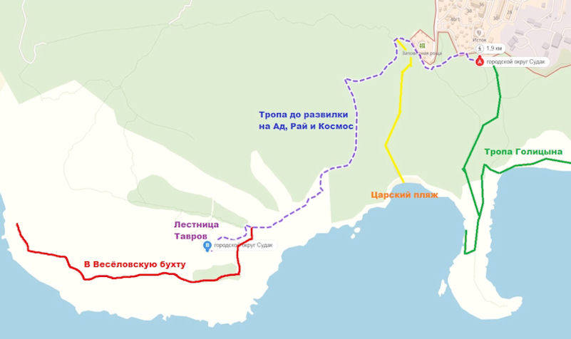 Расстояние. От посёлка Новый Свет до Весёловской бухты около 4 километров, до Долины Рая 1,5 км, да и до Ада столько же. Учитывайте, что времени на подъёмы и спуски надо значительно больше, чем по прямой поверхности.