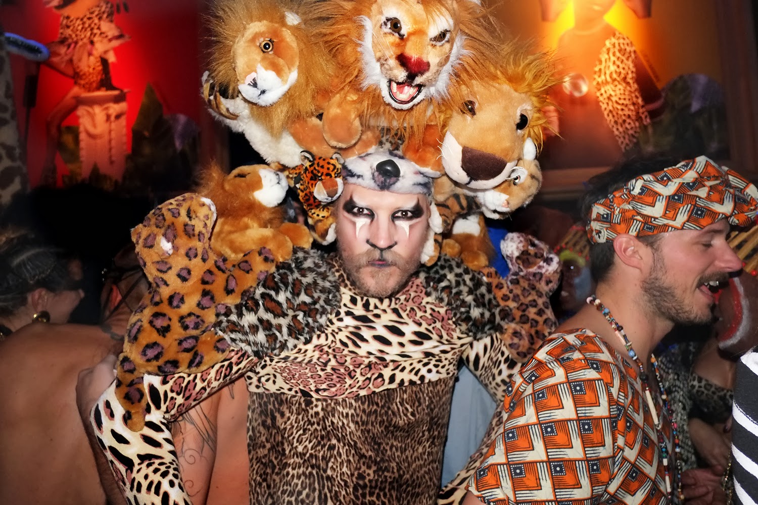 материал под зебру, тигра, жирафа или футболки с тематическими картинками. Забавный львенок или сексапильная львица, путешественник в неизменном пробковом шлеме, юбка из тканевых бананов и кокосовый бюстгальтер и.… Фантазируйте!
