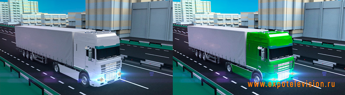 Акцент на машине потребовал от нас качественной проработки деталей и анимации кабины, колес, кузова и хромированных элементов. В процессе выбора базовой модели фуры мы перебрали несколько вариантов 3D моделей грузовиков и в итоге остановились на Renault.