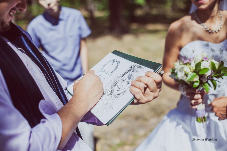 Близкое к предыдущим пунктам и несомненно успешное интерактивное развлечение на праздник – это шаржи! Если традиционные фото или фотомагниты в подарок гостям кажутся вам слишком предсказуемыми, подойдите к выбору развлечений творчески! Профессиональный шаржист на свадьбу за время праздника создаст прекрасные рисунки для всех желающих!