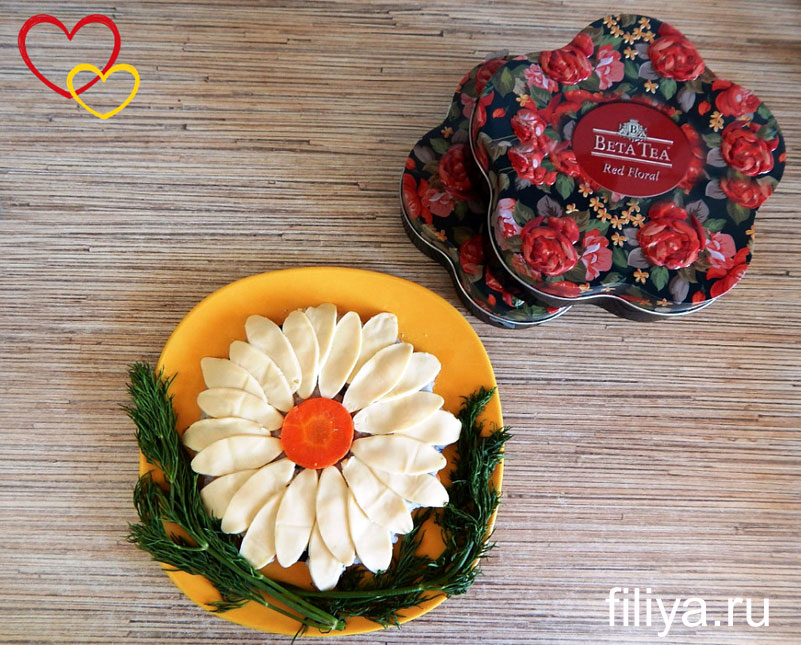Включите креативность и у вас получатся самые разные варианты дизайна для одного и того же салата, но для разных случаев. Меняйте формы и придумывайте новые уникальные рецепты украшения новогодних и повседневных блюд. У каждой хозяйки всё это будет по-разному, ведь у всех есть своё видение прекрасного.