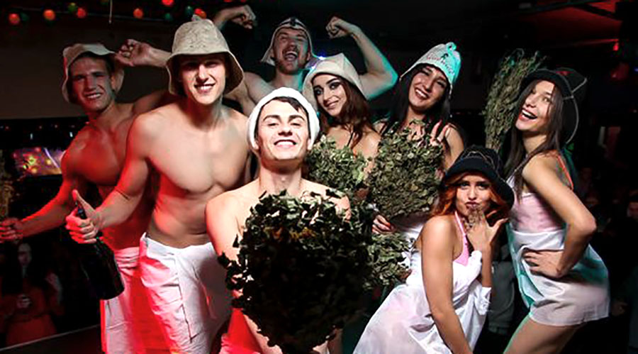 Разумнее одеть что-то удобное и простое, что легко снять и не страшно повесить на общую вешалку. Дорогие украшения лучше оставить дома – традиционно в парилке на теле не должно быть ничего, кроме банных аксессуаров. Повышенная влажность, много людей переодевается, что-то может потеряться, что-то испортиться от контакта с водой.