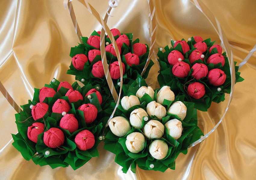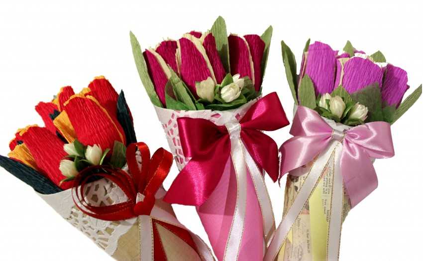 Не менее оригинально выглядят весенние тюльпаны – самый подходящий цветок к 8 марта или 14 февраля, да и в другое время такой презент точно не будет отвергнут. Изготовление его таково: