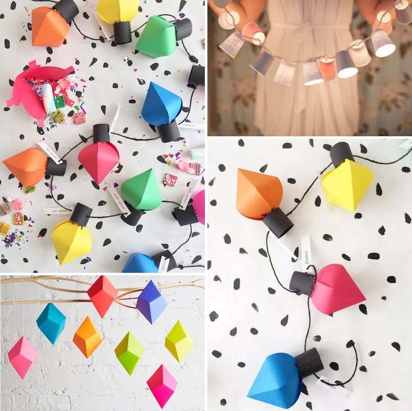 - Фонарики. Гирлянды из бумажных фонариков делаются быстро и просто, а подсветкой могут служить светодиоды на проводах.