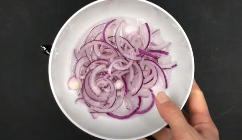 - Красный лук очистите от шелухи и нарежьте на тонкие полукольца. Лук можно замариновать в уксусе.