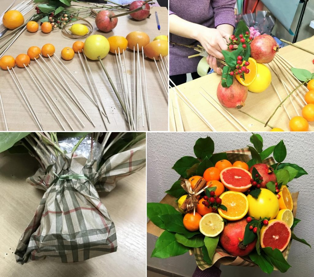 - Цветы обрезать и вставить в губку. Букет можно дополнить конфетами, орехами, физалисом и сухофруктами.