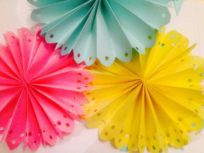 3. Проделайте те же шаги еще c двумя-тремя листами бумаги и соедините все заготовки вместе в целый круг. Чтобы веер стал еще красивее, концы сложенной гармошки можно закруглить или обрезать фигурными ножницами, а с помощью дырокола — нанести на вертушку орнамент.