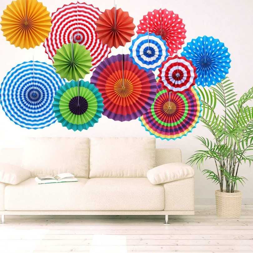 Чем ярче бумага, тем интереснее получится композиция. Сочетанием разных оттенков можно добиться интересного эффекта. Из остатков бумаги вполне можно сделать цветы или другие простые украшения для дома. Они идеально подойдут в декорировании помещений для праздника, тематической вечеринки, дня рождения или свадьбы. «Размашистые» бумажные веера на стену делаются по той же технологии, только без кругового склеивания.