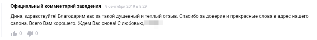 Завершая ответ на отзыв, совершите призыв к действию – вернуться к вам еще. Обычно он звучит, как «будем рады видеть вас снова». Помните, что это – ваша возможность предложить человеку воспользоваться другими услугами в заведении.