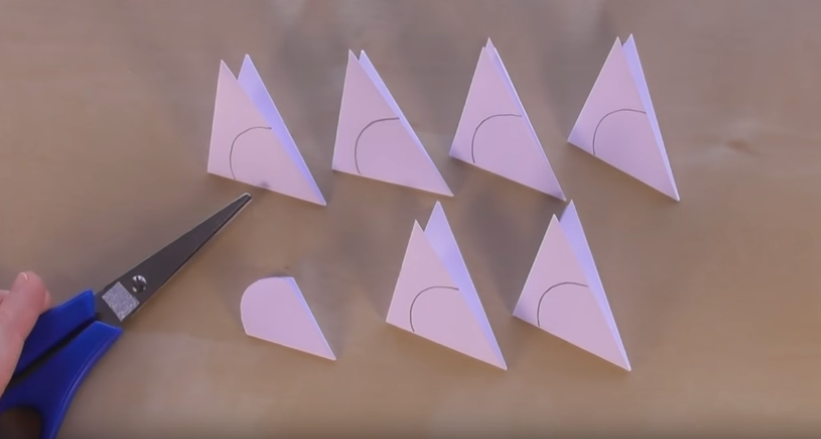 Берем квадрат складываем его в виде треугольника, потом еще раз и еще раз (3 раза), в итоге у нас получается маленький треугольник. На детали рисуем полу круг как на фото, а потом обрезаем по линии. Аналогично мы делаем со всеми шестью деталями.
