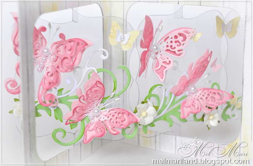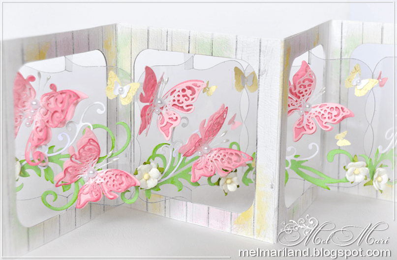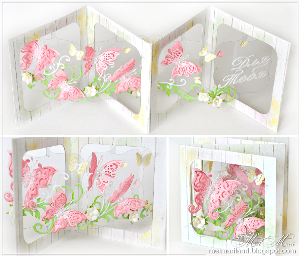 Теперь можно приступить к самой творческой части создания открыточки – ее декорированию! Приклеиваем к пластику порхающих бабочек и витую зелень. Открытка готова!