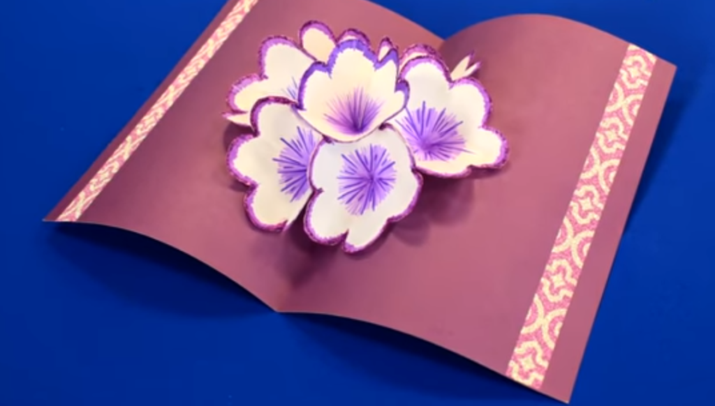 У каждого цветка проработаем все линии сгиба и склеим все бутоны вместе так, чтобы при открытии открытки раскрывались все цветочки.