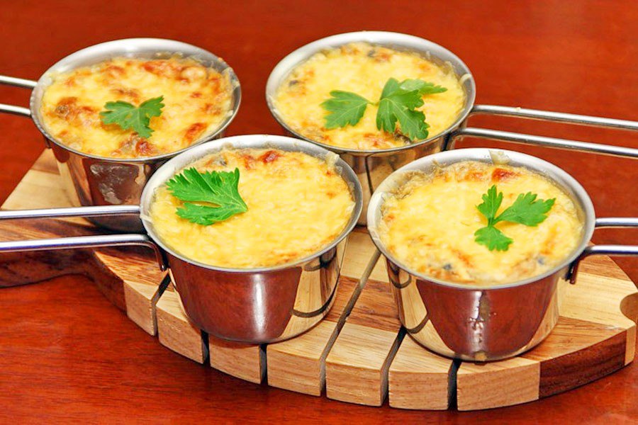 Тебе понадобится: 2 свежемороженые скумбрии, 8 картошек, 2 крупные луковицы, 350 г грибов, 220 г твердого сыра, 2 дольки чеснока, 2 плавленых сырка, специи, соевый соус, оливковое масло.