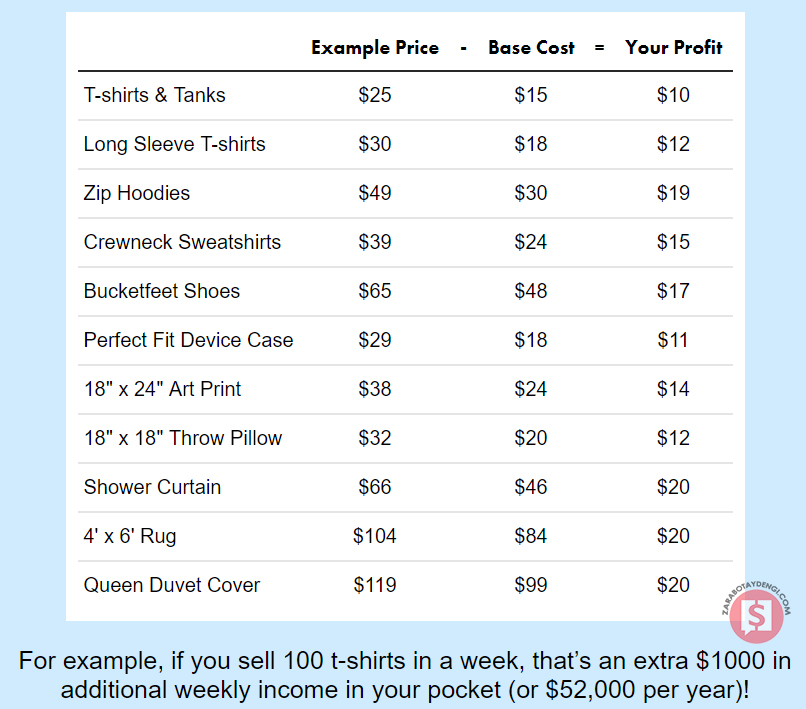 Пример: Базовая цена на черную футболку с рисунком составляет $ 19,99. Допустим, вы решили продать его клиентам по розничной цене $ 23,99. Ваша прибыль в этом случае составляет 4 доллара.