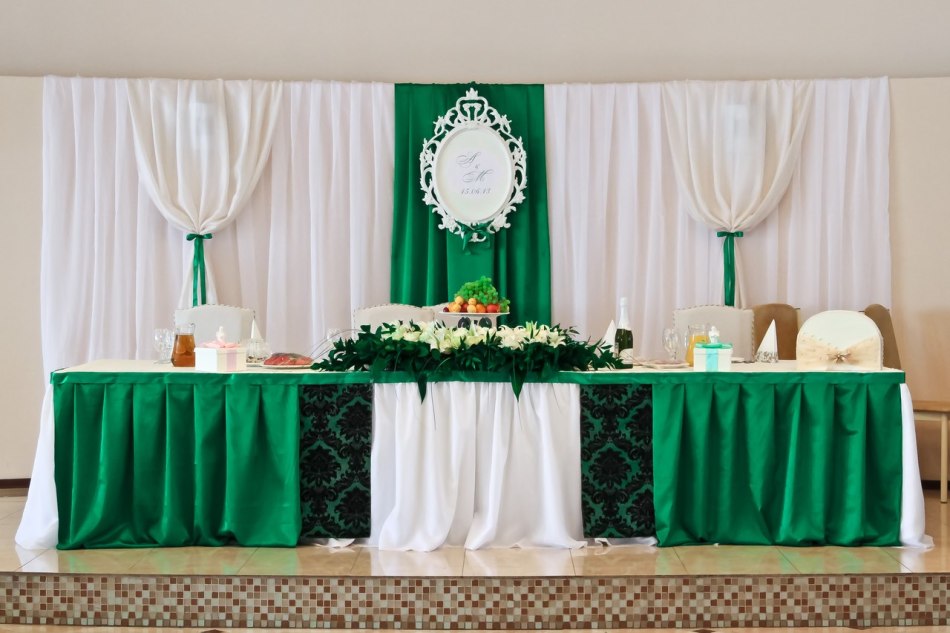 Помещение, где будет проходить торжество по случаю изумрудной свадьбы нужно декорировать зеленым цветом — можно повесить зеленые занавески, постелить на стол зеленые скатерти. Меню праздничного стола должно быть питательным, но без особых изысков и вычурности.