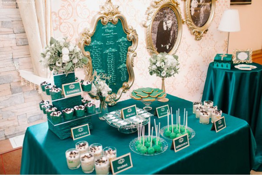 Основой стола для подобного мероприятия является свадебный торт. Его можно как испечь самостоятельно, так и заказать в кондитерской. Дополнить сладкую карту можно капкейками, либо шоколадным фонтаном. Белый шоколад можно красителем окрасить в нужный изумрудный цвет. А на капкейки поместить инициалы супружеской пары. В случае домашнего мероприятия можно организовать шведский стол с самыми разнообразными закусками.