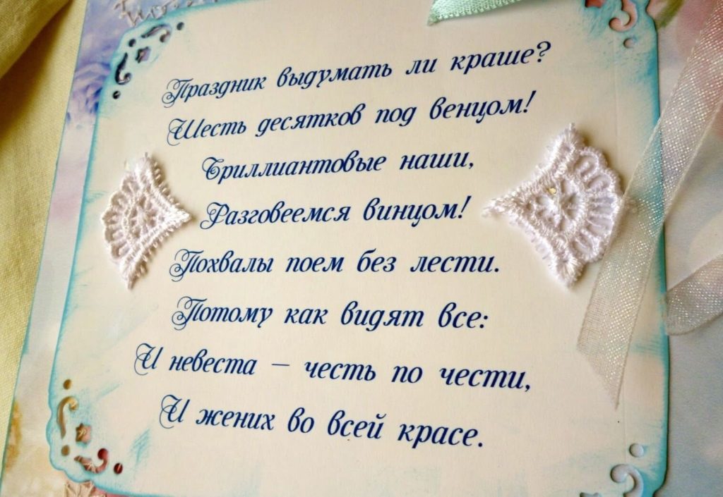 Чета такая – редчайший в мире экземпляр, Как бриллиант, что в 7 карат граненый, И ваша пара – бриллиантовый сегодня юбиляр, Шестьдесят лет стучат сердца влюбленных. Вы чтили каждый год семьи рожденье, И было многое в судьбе – любовь светила, Такой семейный стаж внушает уваженье, Пускай Господь вам прибавляет силы.