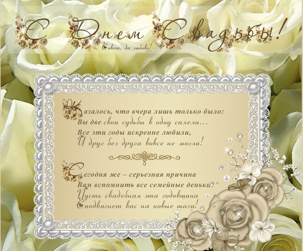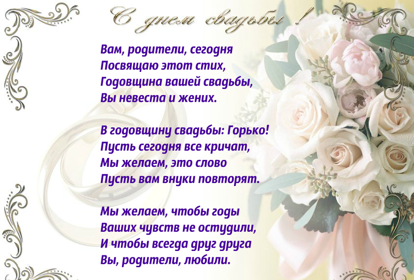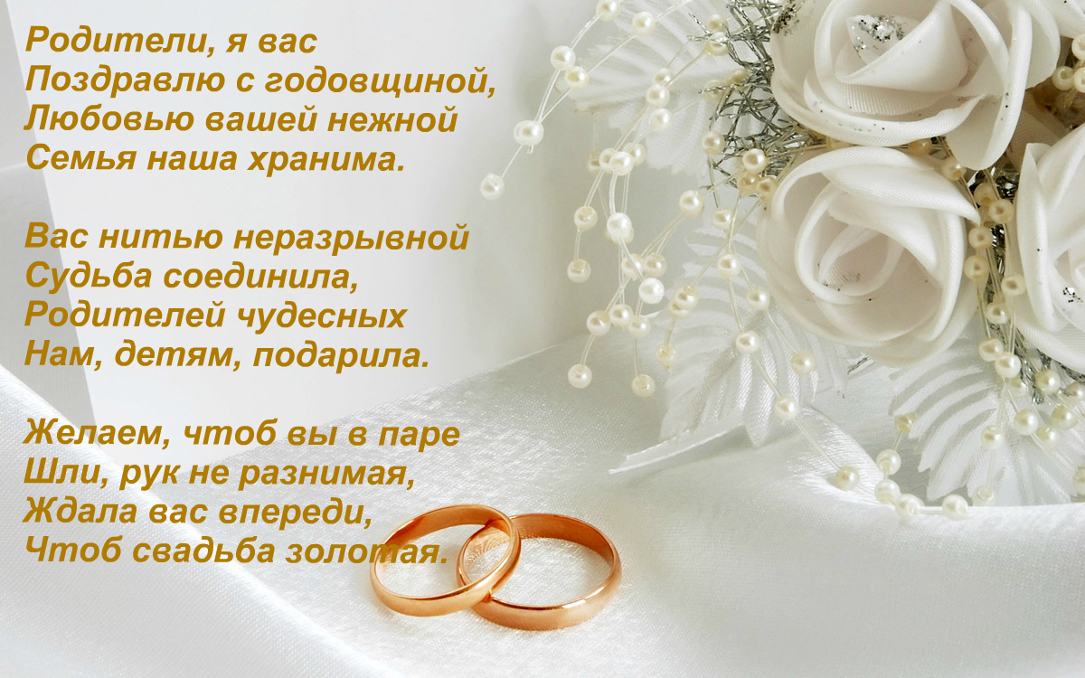 - Дорогие, милые и любимые мои родители! В этот замечательный день я от чистого сердца хочу Вас поздравить с годовщиной свадьбы. Ваш крепкий союз всегда был и остается примером и идеалом. Желаю крепкого здоровья, долгих лет жизни и много-много совместных радостных моментов.