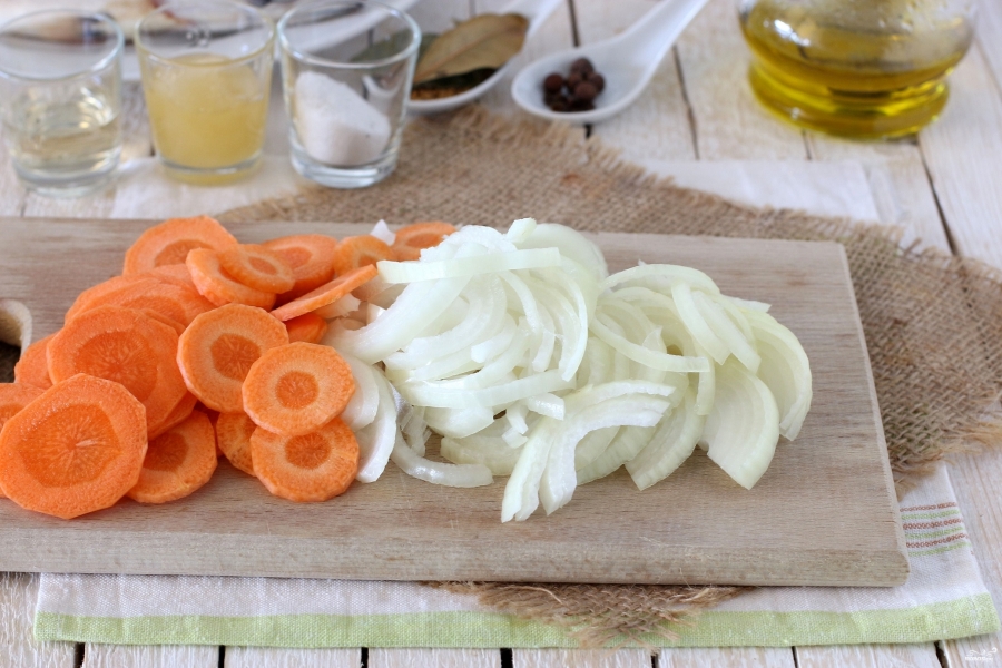 Наливаем в кастрюлю воду и ставим на огонь. А пока вода закипает, тем временем можно нарезать овощи. Морковь моем, чистим и нарезаем кружочками, а лук полукольцами.