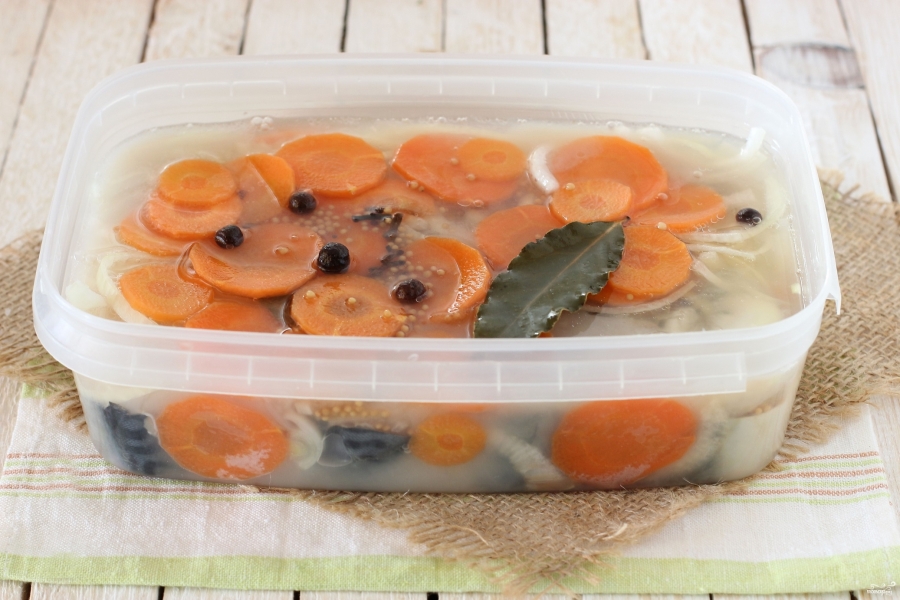 А вот потом уже заливаем самим маринадом и помещаем на сутки в холодильник.