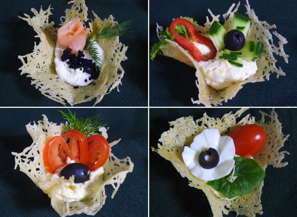 Закуcочные блюда формуют в кулечки, тарталетки, сделанные из лепешки. Чтобы они держали форму, их предварительно запекают. Тогда они получаются необыкновенно хрустящими, отчего, еще более притягательными. Такие варианты просто находка для праздничного стола.