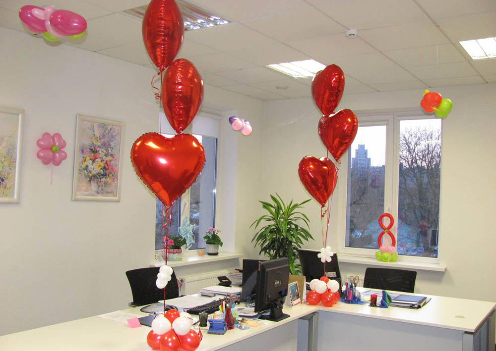 - Разноцветные ленточки. Данная атрибутика создает момент торжественности, поэтому не стесняемся ее использовать. Украсить ими можно все что угодно – начиная от стен и заканчивая рабочим местом сотрудниц.
