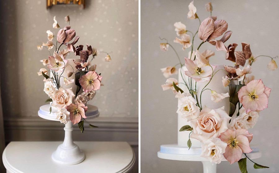 19. Для декора торта на свадьбе 2022 подойдут и огромные сахарные цветы, которые сами по себе уже выглядят как произведения искусства. Торт в этом случае должен быть лаконичным, чтобы не «спорить» с роскошным украшением: