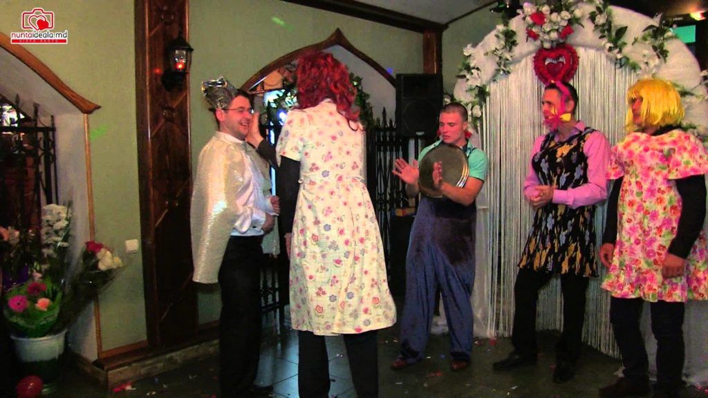 Второй ведущий изображает дикаря, проводя над парой «обряд» бракосочетания. Он делает пассы руками, прыгает, с разными интонациями произносит «У!» Первый ведущий прерывает его и говорит: «Вот три варианта бракосочетания, которые вы могли сегодня использовать. Но очень здорово, что вы не стали оригинальничать и поженились традиционно».