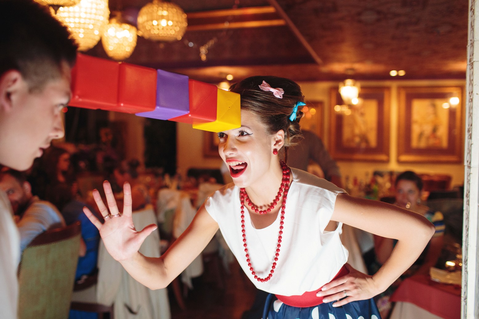 Самые веселые конкурсы на свадьбе часто проводятся, когда все участники еще находятся за столами, в первой половине праздничной программы. Они развлекают, а не утомляют приглашенных. Включив их в свое торжество, вы убедитесь, что в каждом из взрослых живет маленький ребенок, готовый к веселью и шуткам, озорным поступкам. Застольные развлечения станут хорошей альтернативой энергичной части программы, но при этом не будут лишены юмора.