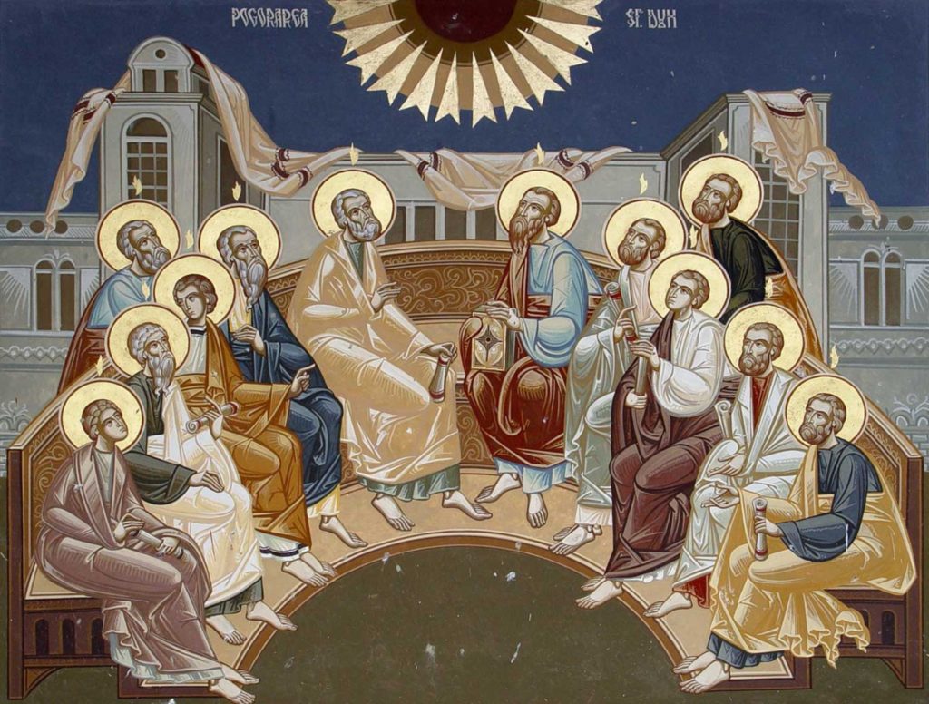 На 50-ый день после воскрешения и на 10-ый после Христова Вознесения иудеи праздновали начало жатвы. Апостолы с Богоматерью находились в сионском доме. Вдруг в середине дня раздался оглушительный шум, как при урагане. Над головами присутствующих повисли языки пламени, они сияли, но не обжигали. Это был тот самый Дух-Утешитель, обещанный Спасителем. Огненные языки снизошли на апостольские головы. В тот же миг христовы ученики получили необыкновенный дар: они заговорили на языках других народов. Эта способность дала им возможность проповедовать евангельское учение во всех краях.