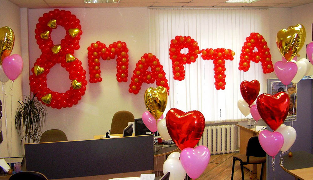 - Разноцветные ленточки. Данная атрибутика создает момент торжественности, поэтому не стесняемся ее использовать. Украсить ими можно все что угодно – начиная от стен и заканчивая рабочим местом сотрудниц.