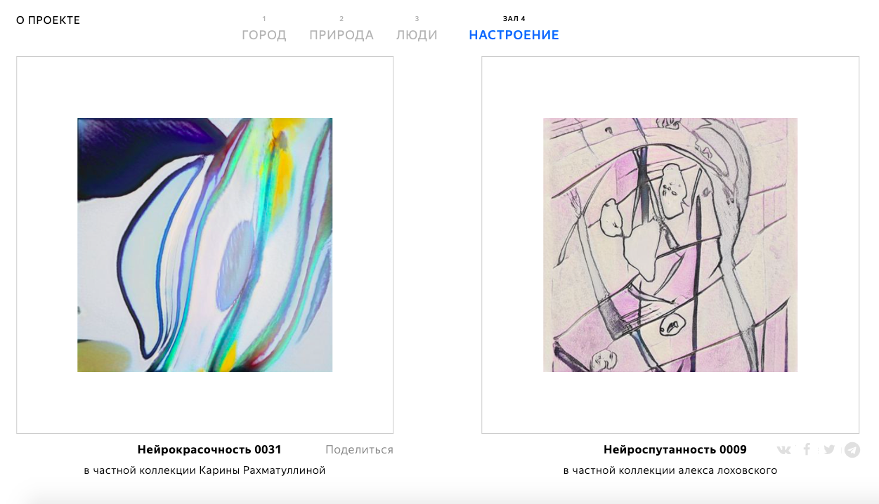 - Выставка «Искусственное искусство» в галерее Яндекса. На ней представлено 4 000 произведений, созданных и отобранных нейросетью. Каждую из работ — оригинал — можно забрать себе в коллекцию.