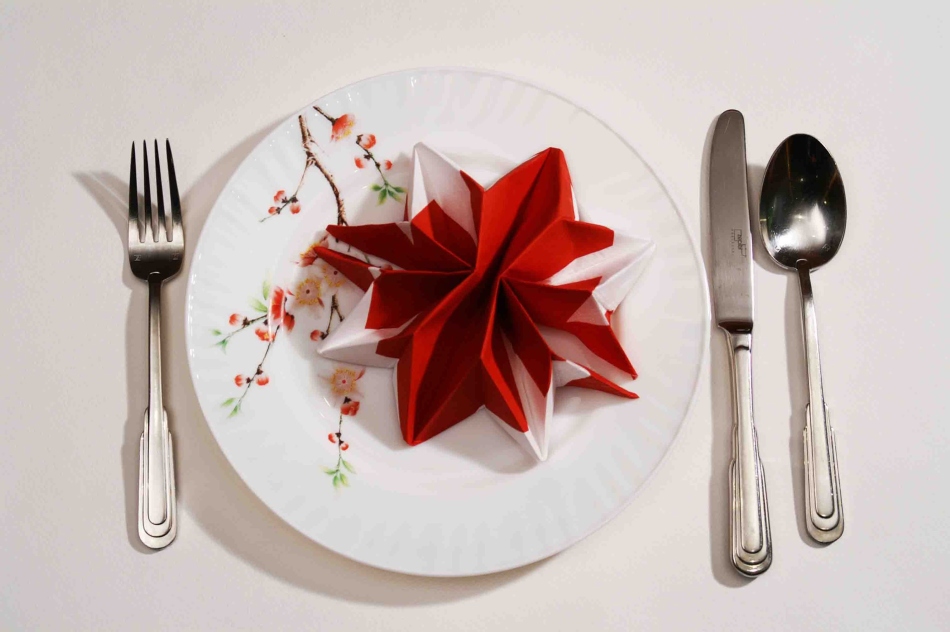 Для декора можно использовать как тканевые, так и бумажные одноразовые салфетки. Мы остановимся на втором варианте, так как достаточное количество льняных или хлопковых найдется не в каждом доме. Использоваться при этом могут как изделия одного цвета, так и сочетание нескольких. В предложенном мастер-классе вы научитесь, как красиво сложить бумажные салфетки двух цветов. В данном случае – красного и белого. Такой способ, который носит название «Двухцветное перо» считается одним из наиболее праздничных и эффектных.