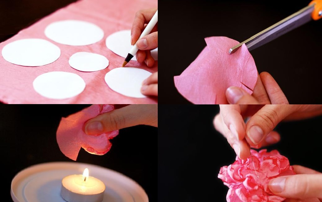 - далее требуется действовать аккуратно, последовательно поднося заготовки к зажженной свече, чтобы оплавить края лепестков. Располагайте ткань на расстоянии не ближе чем 3 см от огня — иначе шелк расплавится, к тому же существует риск обжечь пальцы. Вращайте заготовку, придавая каждому лепесточку нужную декоративную форму;