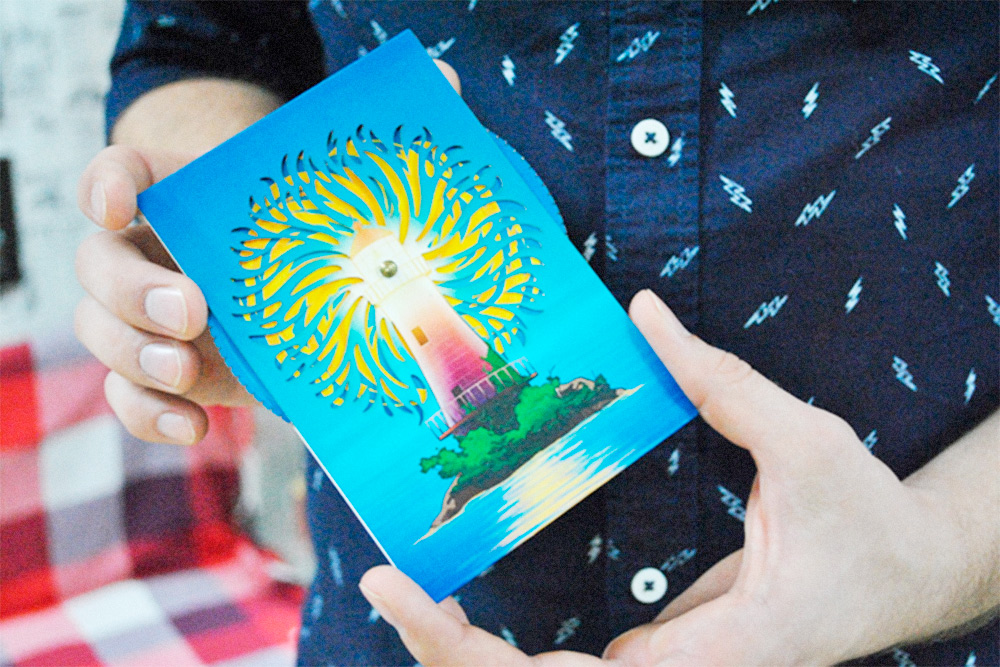 У каждого брата есть свое личное увлечение. У Максима это изготовление игрушек. Если покрутить шестеренку в торце открытки, за маяком «вспыхнет» яркое солнце. Эта игрушка стоит 550 рублей. Такие изделия очень популярны в Европе, США и Японии