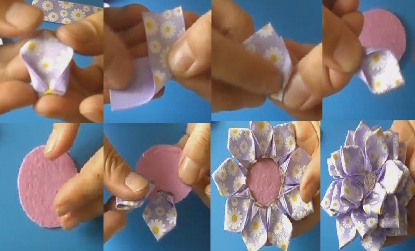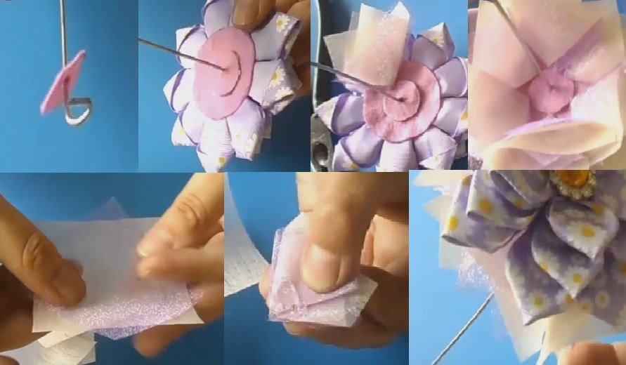 - Дальше нужно нарезать органзу и флазелин одинаковыми квадратиками по 6см. Их понадобится 6 штук. Эту кусочки следует сложить друг на друга ромбиком и согнуть их пополам 2 раза. Небольшой ромб, который получился, нужно приклеить на дно цветка. Повторить эту процедуру необходимо 5 раз;