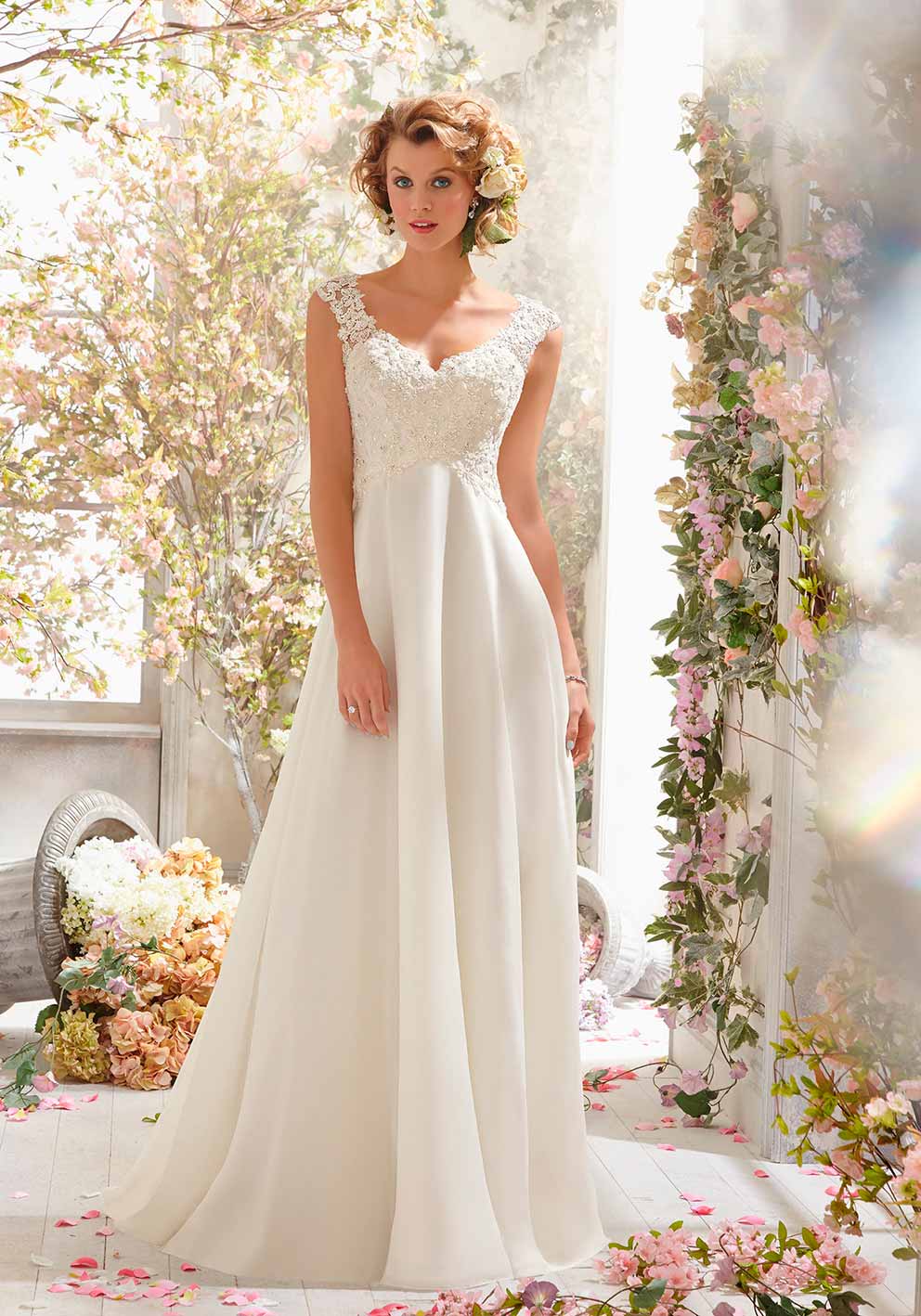 Скрыть животик поможет платье в стиле ампир. Это классический вариант, в котором нужный эффект создается за счёт высокой талии – она подчеркивает самую узкую часть туловища. Очень хорошо смотрятся свадебные платья с кружевом без бретелей – в них ткань красиво струится над животом и маскирует его. Греческий стиль действует аналогично, как и любые другие модели А-силуэта.