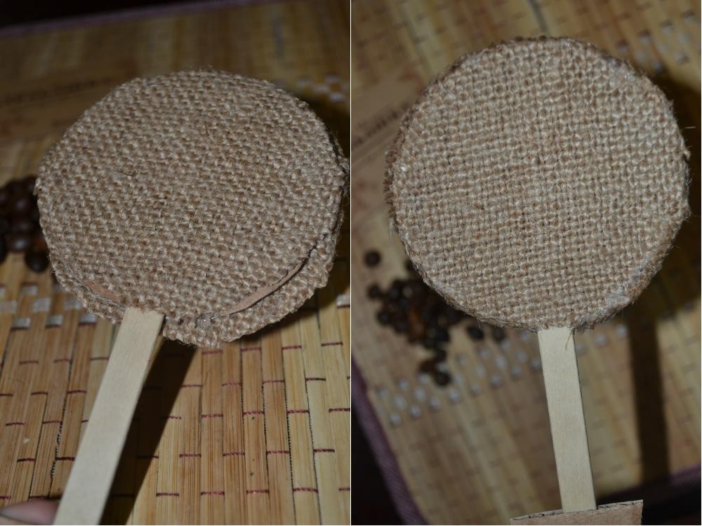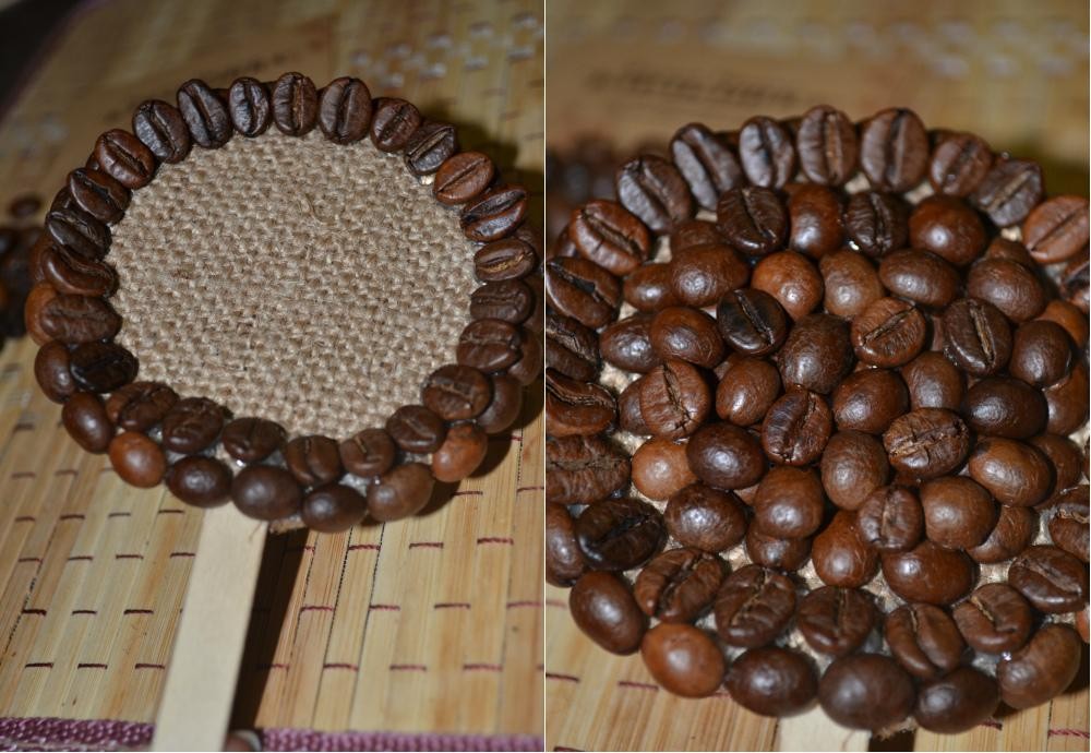 На лицевую сторону клеим зерна кофе. Первый ряд по краю приклеиваем зерна плоской стороной вниз, а второй ряд – плоской стороной вверх. Центр заполняем зернами, а затем клеим второй ряд.