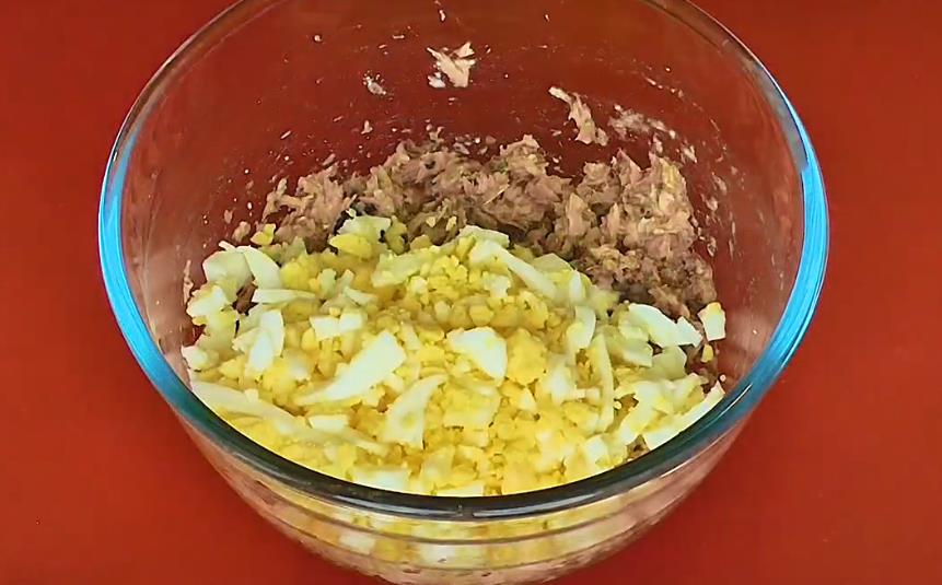 Консервированного тунца размять вилкой. Яйца отварить, нашинковать небольшими кусочками.