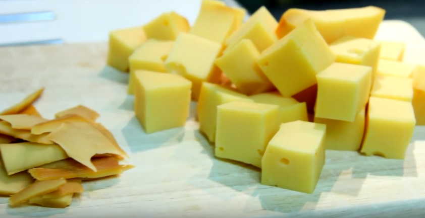 2. Сыр нарезаем кубиками размером в 1,5-2 сантиметра.
