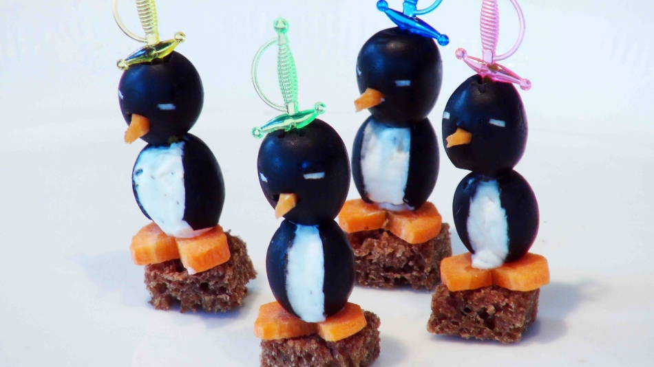 - Кусочек твердого сыра, маленький кусочек ветчины, оливка без косточки.