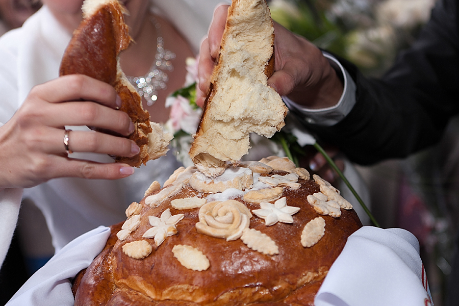 Нельзя просто кусать каравай, это считается дурным знаком. Но, часто влюбленные об этом не знают. Надо отламывать понемногу от своего кусочка каравая.