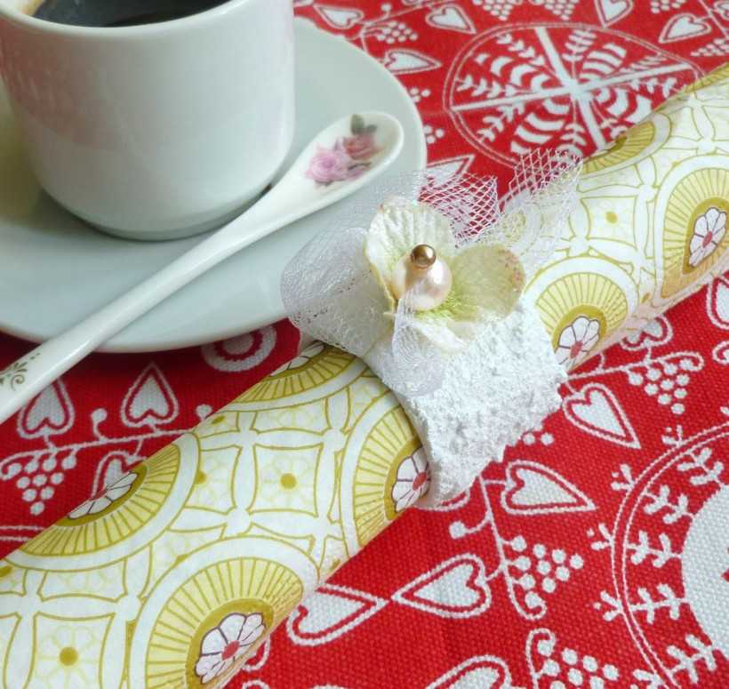 Одевают их не только на салфетки из ткани, но и на бумажные. Выигрышно смотрятся кольца – держатели на однотонных салфетках.