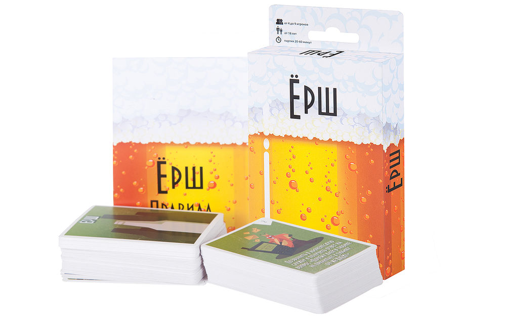 Ерш – это в прямом смысле алкогольная игра. В плотной колоде каждая карта содержит задание, которое игрок либо выполняет, либо сдается и выпивает. Среди карт так же есть бонусные, чтобы приколоться над другими игроками или защитить себя. Вариантов много и все они описаны в сопутствующих правилах. Ерш – это отличный выбор для нетрезвой компании;