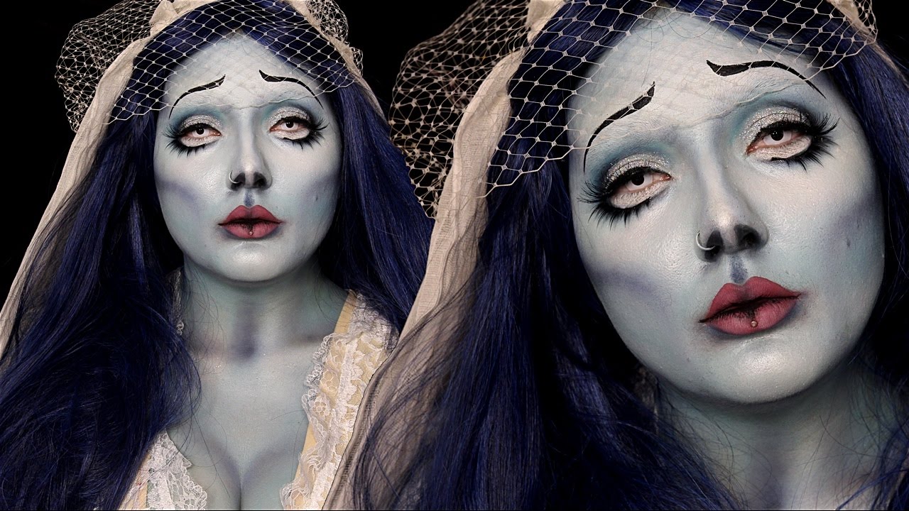 В создании образа мертвой невесты часто также задействуется бело-голубой грим и темный макияж в стиле смоки-айз. Губы в таком образе можно скрыть светлой основой или же выделить алой помадой.