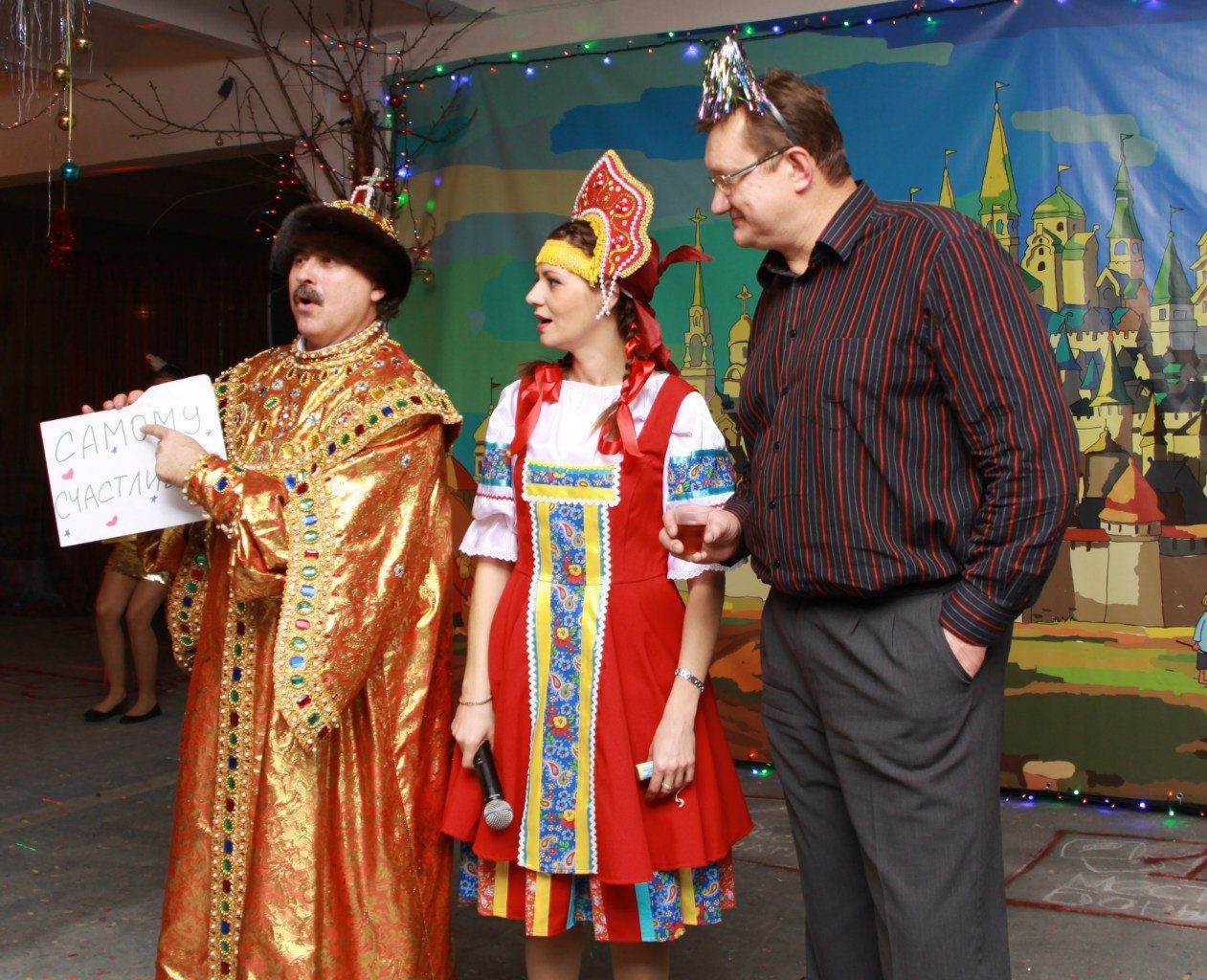 Сцена: Сказка о золотой рыбке. Действие происходит близ расположившейся публики с участием гостей мероприятия. Ведущий заранее определяется роли: