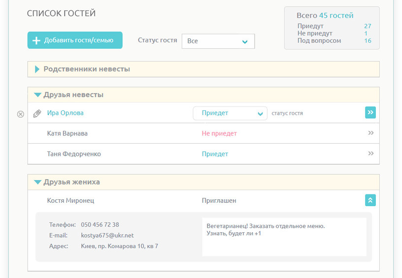 Число гостей может меняться, но ты должна знать его хотя бы приблизительно. Поверь на слово, количество дел при подготовке к свадьбе на 30 человек и на 130 отличается разительно 🙂 От числа приглашенных зависит место проведения, шоу-программа, торт и, конечно же, размер расходов. Воспользуйся нашим сервисом “Список гостей”: здесь ты сможешь отмечать, какой ответ дал гость, его адрес и есть ли у него дополнительные пожелания. Смотри, как это выглядит: