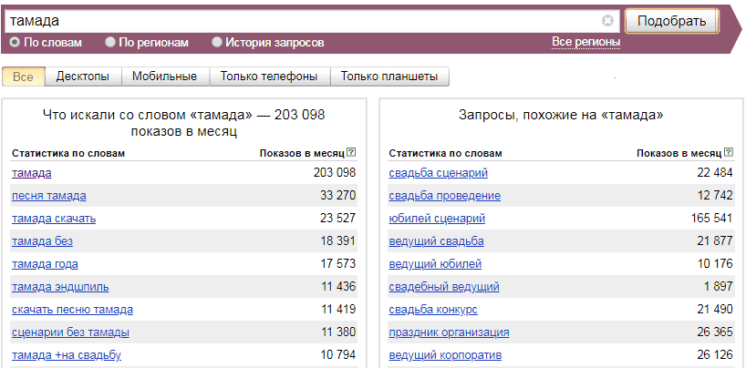 Оценить востребованность услуг тамады можно с помощью бесплатного сервиса Yandex Wordstat. Он дает возможность оценить не только спрос по ключевым словам, но и составляет статистику в разрезе городов.